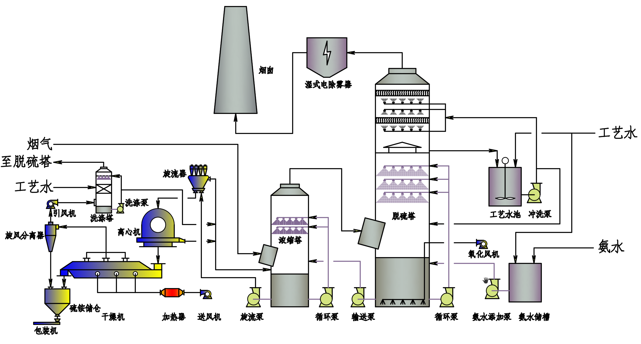 氨法脫硫工藝是用氨吸收劑吸收煙氣中的二氧化硫,吸收液經壓縮空氣氧化生成硫酸銨,再經塔內飽和結晶或者塔外加熱蒸發結晶析出硫酸銨,過濾干燥后得產品。