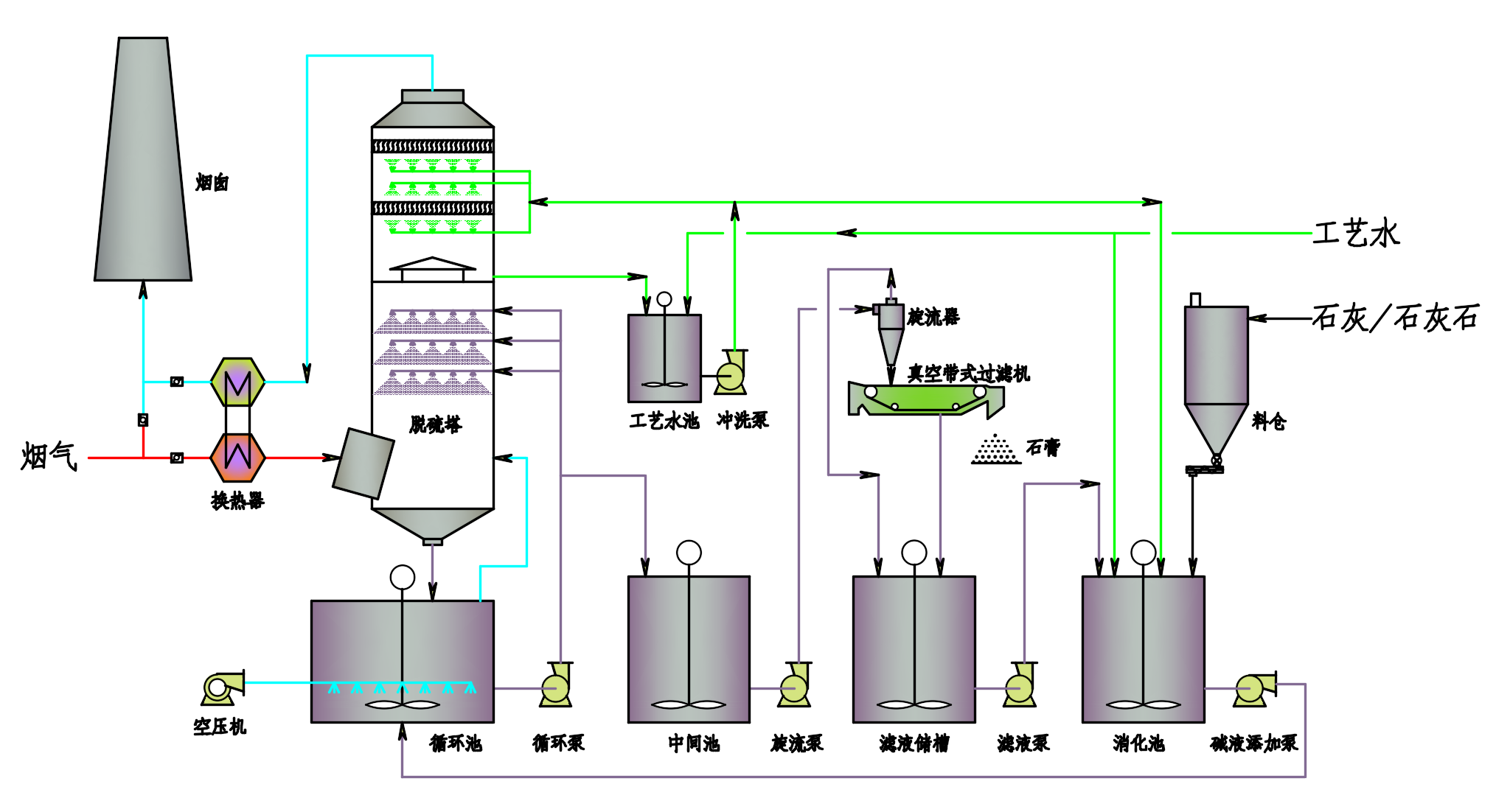 整個雙堿法脫硫工藝由五個工序組成:脫硫工序、再生工序、氧化工序、石膏脫水工序、制漿工序。