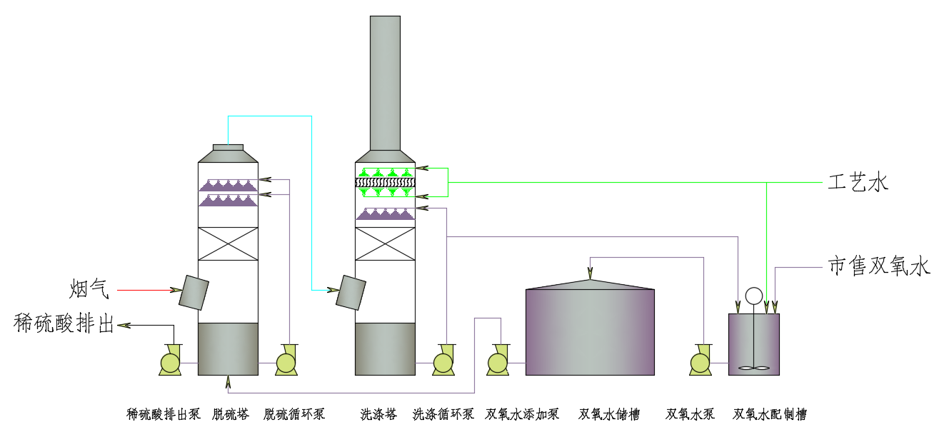 雙氧水脫硫是采用27.5%雙氧水(過氧化氫溶液)經稀釋到8.5%的安全濃度后進行塔內脫硫。過氧化氫在酸性溶液中將二氧化硫氧化,生成硫酸。硫酸可以和水以任一比例混溶,不會造成過飽和結晶,造成結垢堵塞問題,因此,采用雙氧水法脫硫工藝提高了系統的可靠性,降低了投資及運行費用。同時稀硫酸可以作為化工原料出售,不會產生二次污染問題。