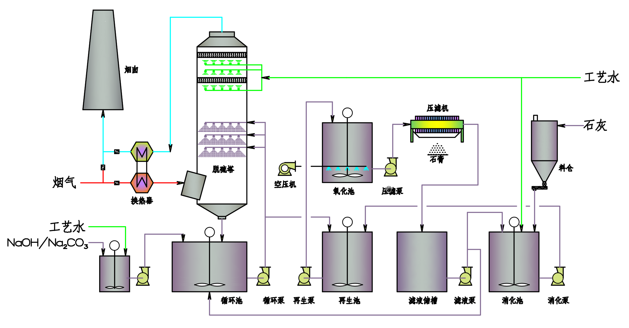雙堿法煙氣脫硫技術是利用氫氧化鈉溶液作為啟動脫硫劑,配制好的氫氧化鈉溶液直接打入脫硫塔洗滌脫除煙氣中SO2來達到煙氣脫硫的目的,然后脫硫產物經脫硫劑再生池還原成氫氧化鈉再打回脫硫塔內循環使用。雙堿法是采用鈉基脫硫劑進行塔內脫硫,由于鈉基脫硫劑堿性強,吸收二氧化硫后反應產物溶解度大,不會造成過飽和結晶,造成結垢堵塞問題。