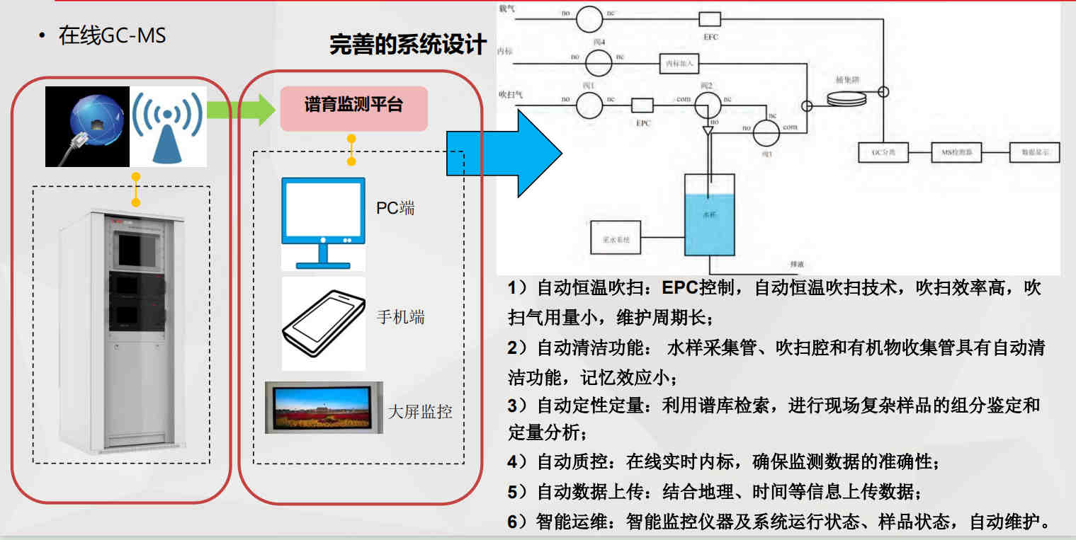 - ● 系統將水樣采集并送入吹掃裝置,然后向吹掃腔中通入吹掃氣體,將待測水樣中VOCs 組分吹出,將VOCs富集在吸附管中,然后采用熱解吸的方式將樣品從吸附管中解吸出來,由載氣帶入色譜柱中進行分析,經過分離后的樣品進入到質譜檢測器中被分析檢測,得到各目標組分準確的定性定量分析結果。