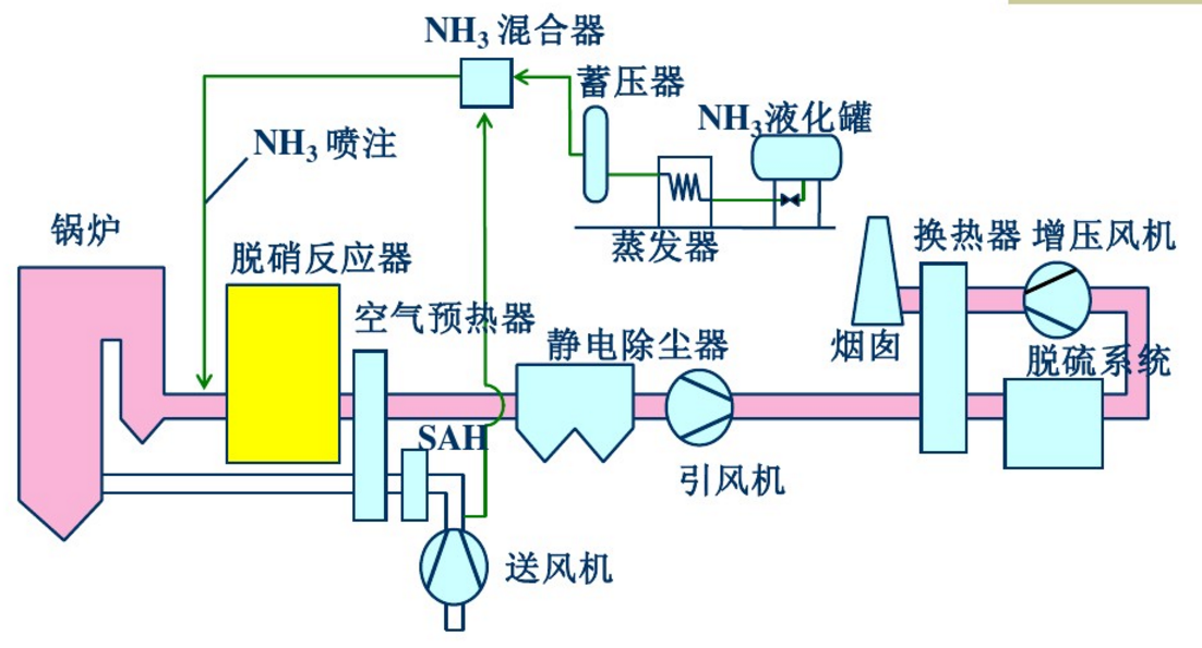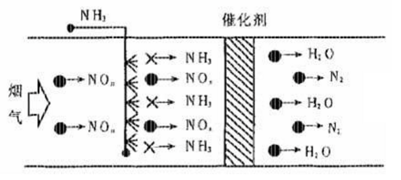 在催化劑作用下,向溫度約280~420℃的煙氣中噴入氨,將NOx還原為N2和H2O。主要反應方程式如下: