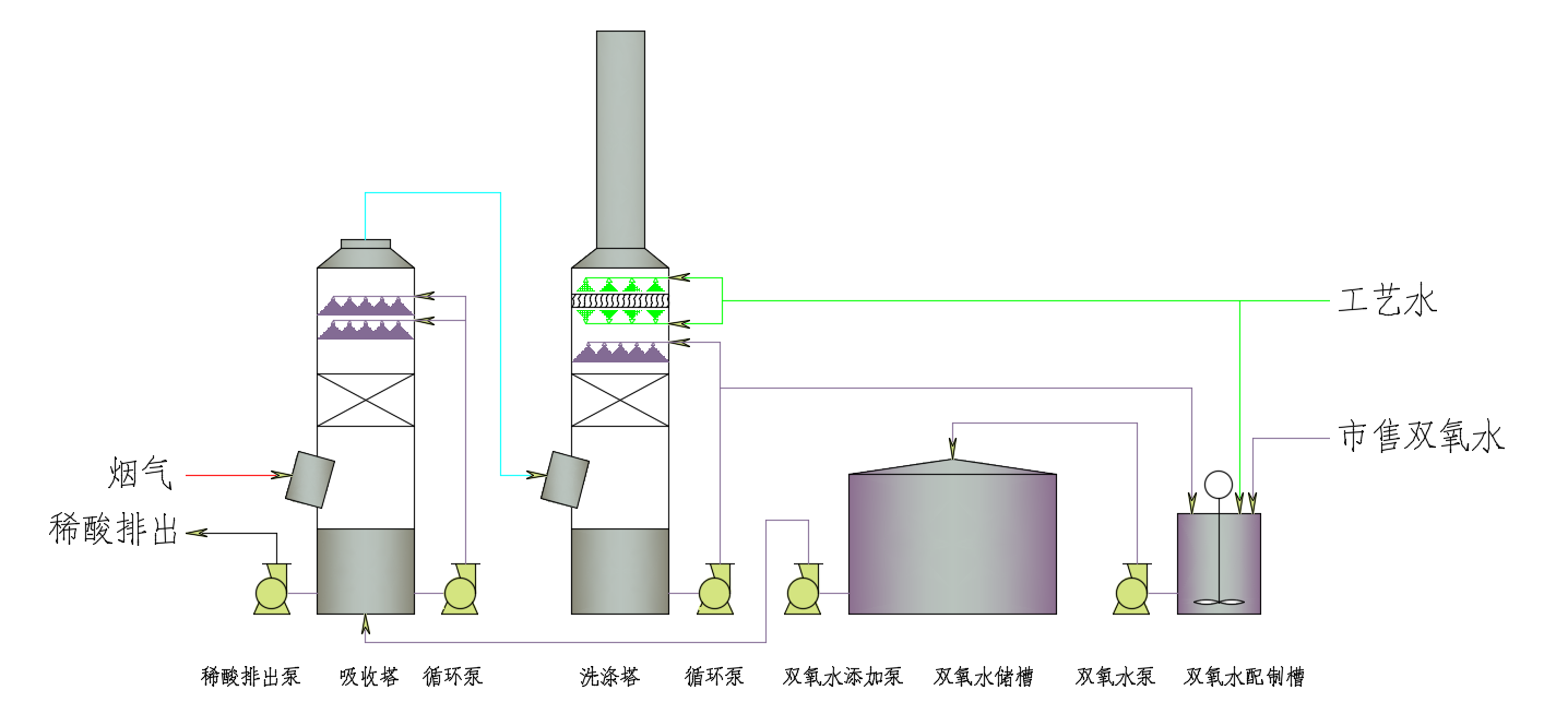 煙氣通過引風機進入冷卻塔或者熱交換器以降低煙氣溫度。冷卻后的煙氣進入吸收塔內和噴淋液逆流接觸,發生化學反應生成低質的稀酸。稀酸達到一定濃度后由稀酸排出泵排出回收利用,煙氣進入洗滌塔內經工藝水洗滌,除霧后由煙囪達標排放。