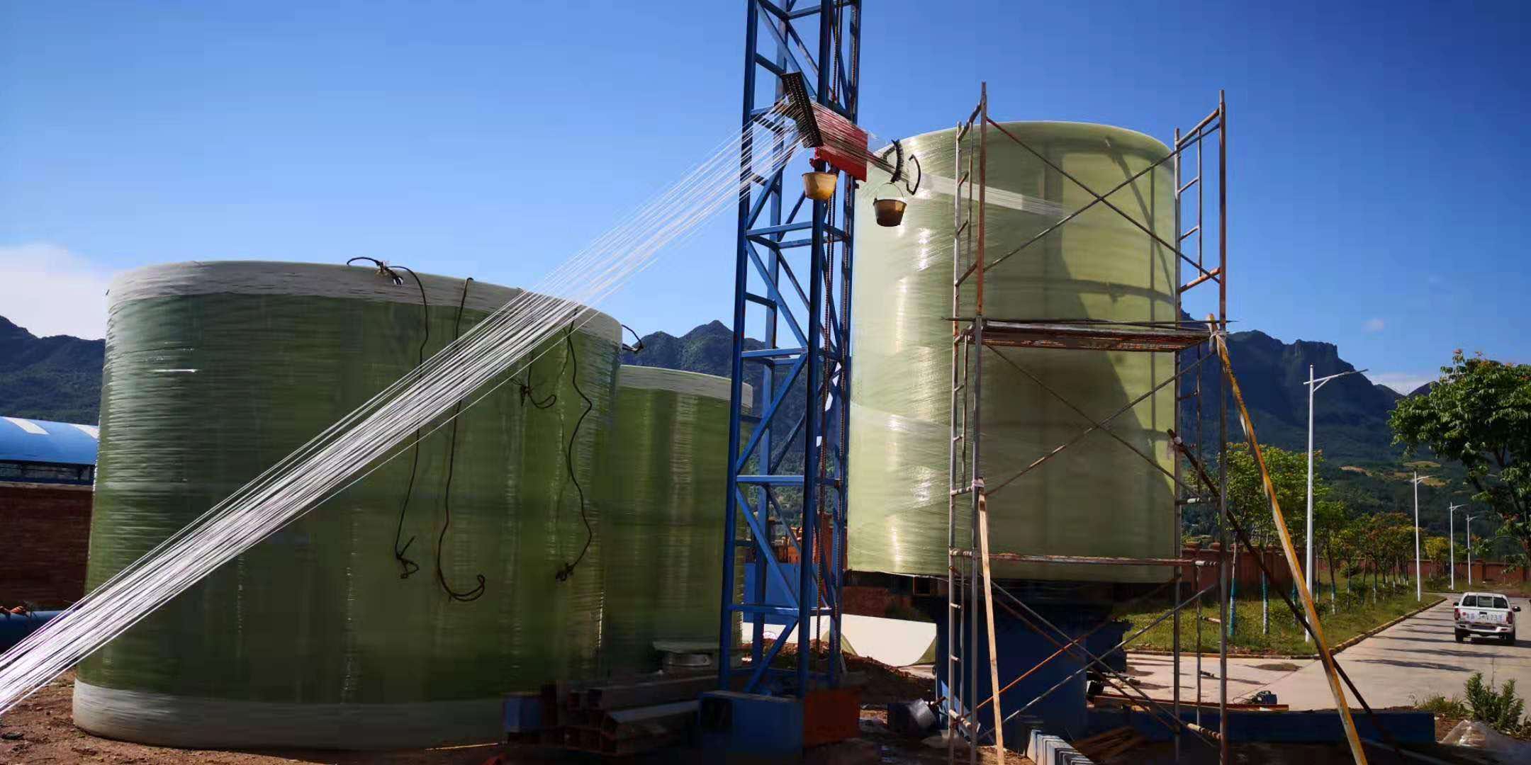 直接超過4.5m的大型玻璃鋼儲罐一般采用現場纏繞的方式。玻璃鋼容器具有輕質、高強、耐腐蝕,容積大,占地小,無需運輸,安裝方便,維修費用低,用戶可以實地監督生產等優點,主要用于石油、化工、食品釀造,醫藥等領域,傳統的大型容器一般采用鋼板焊接制成,內部貼敷環氧玻璃鋼防腐襯里或防腐材料,施工困難,效果不好,易脫落,穿孔。而現場纏繞制作的大型玻璃鋼容器為熱固性樹脂為基體,玻璃纖維為增強材料,采用連續纖維纏繞加噴射紗和環向纏繞,工藝先進,結構合理,制品力學性能好。