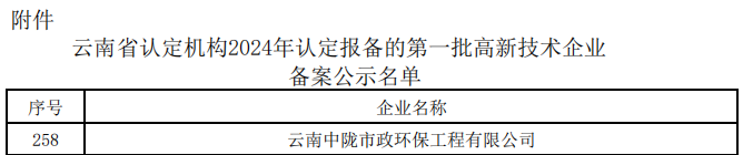 2024年11月1日,全國高新技術企業認定管理工作領導小組辦公室公示了云南省認定機構2024年認定報備的第一批高新技術企業名單,云南中隴市政環保工程有限公司順利通過復審認定,這是中隴市政自2021年首次申報以來的第二次認定獲批。