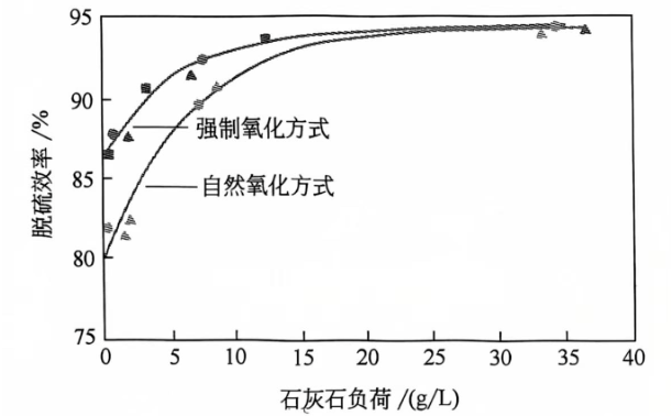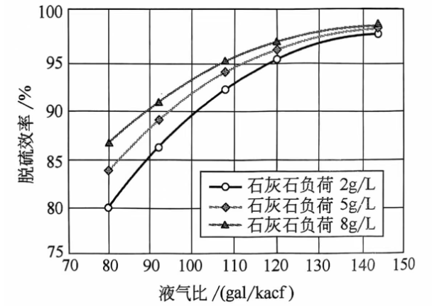 在一定范圍內隨著吸收塔漿液pH值的升高,脫硫效率呈上升趨勢,因為高pH值意味著漿液中有較多的CaCO3或Ca(OH)2存在,有利于脫硫。但高pH值時排出的石膏漿液中石灰石的含量也增加了,直接導致的后果是系統吸收劑利用率降低。在低pH值時,亞硫酸鈣的溶解度增加,但對石灰石的溶解是不利的,最終導致脫硫效率降低。pH值一般應維持在4.5~5.5之間,保證石灰石的溶解及SO2的吸收,此時脫硫效率一般在98%以上。