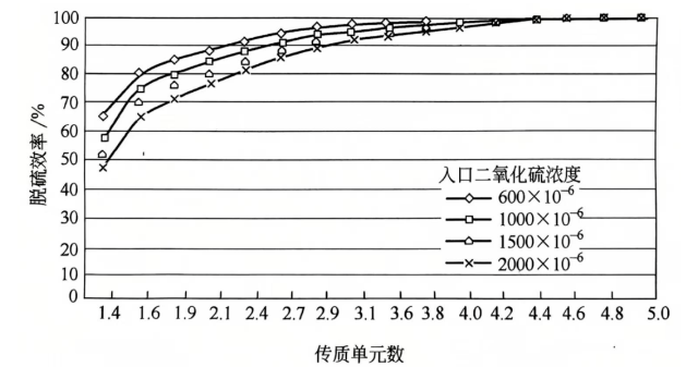 入口SO2濃度對脫硫效率的影響程度取決于液相堿度。在其它條件不變的情況下,當煙氣中的SO2濃度增加時,脫硫效率會有所下降,較高濃度的SO2將迅速耗盡液相堿度,導致吸收SO2的液膜阻力增加。