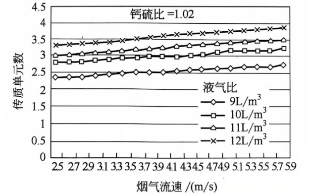液氣比是指與流經吸收塔單位體積煙氣量相對應的漿液噴淋量。提高液氣比相當于增大了吸收塔內的噴淋密度使液氣間的接觸面積增大,傳質單元數將隨之增大, 脫硫效率也將增大。但是在實際工程中,提高液氣比會使漿液循環泵的流量增大, 從而增加設備的投資和能耗。液氣比的最佳范圍根據煙氣中SO2濃度進行合理選擇。