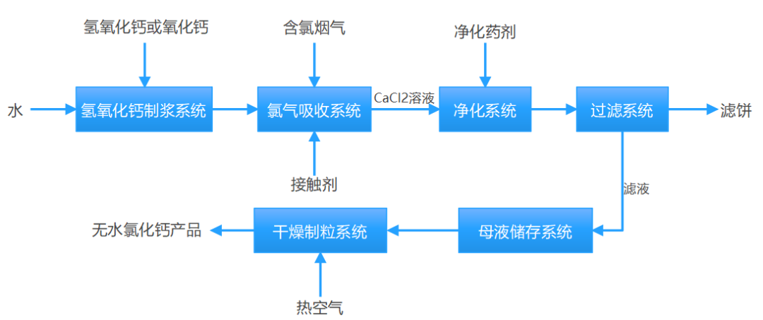含氯煙氣處理工藝系統主要包括煙氣系統、氫氧化鈣制漿系統、氯氣吸收系統、氯化鈣溶液凈化系統、過濾與母液儲存系統、干燥制粒系統、藥劑儲存系統、產品氯化鈣存儲及配電控制系統等。工藝流程框圖如下所示: