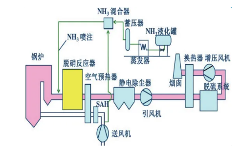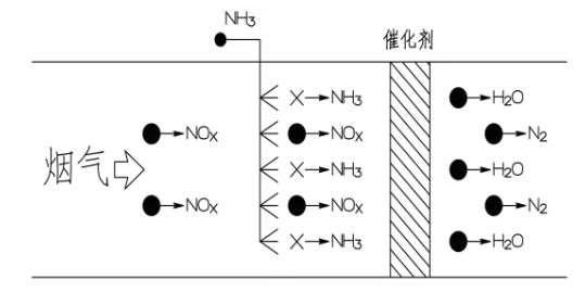在催化劑作用下,向溫度約280~420℃的煙氣中噴入氨,將NOx還原為N2和H2O。主要反應方程式如下: