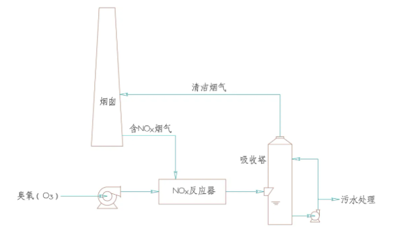 以臭氧為例,臭氧將低價態的氮氧化為高價態的氮,而高價態的氮具有優良的消解性及溶解性,以此為基礎將NOx轉化為可溶性硝酸鹽。被氧化后的氮一般經噴淋塔洗滌吸收,洗滌液一般為堿性溶液,如氫氧化鈉溶液、氫氧化鈣溶液。