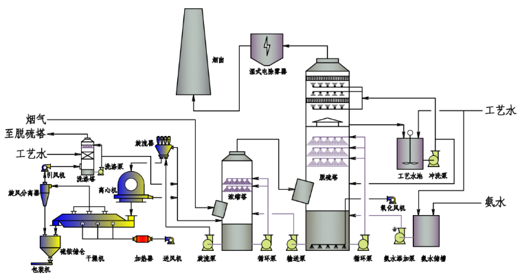 氨法脫硫工藝是用氨吸收劑吸收煙氣中的二氧化硫,吸收液經壓縮空氣氧化生成硫酸銨,再經塔內飽和結晶或者塔外加熱蒸發結晶析出硫酸銨,過濾干燥后得到產品。