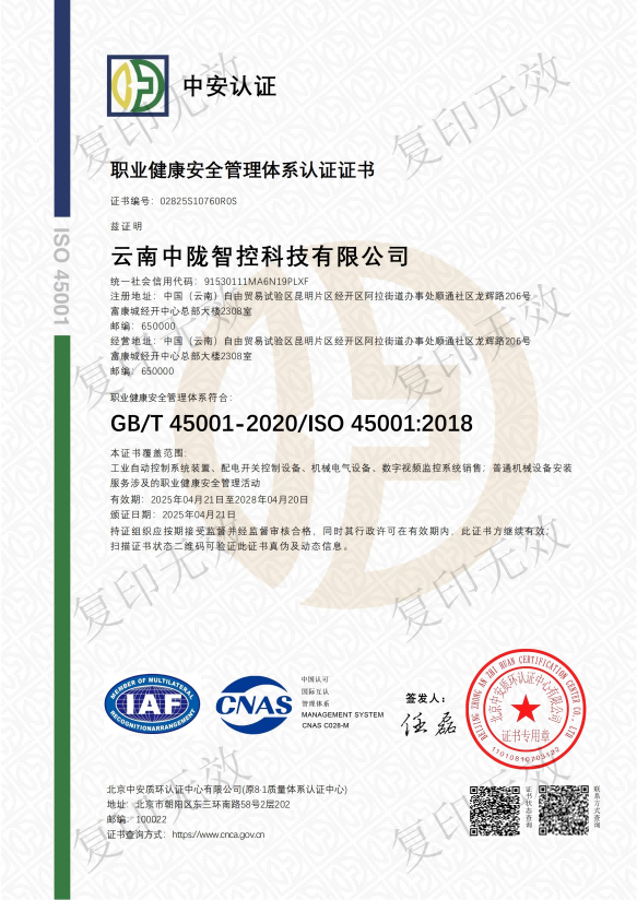 中隴智控ISO 45001職業健康安全管理體系認證證書