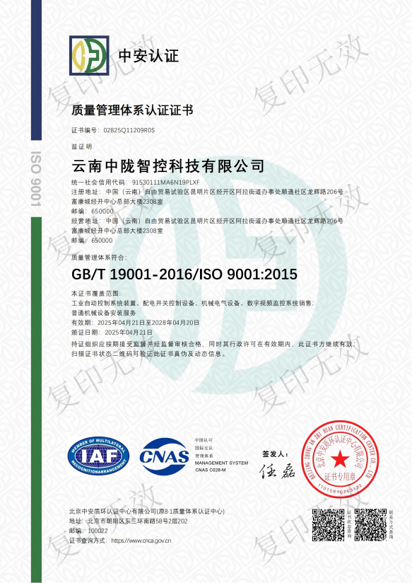 中隴智控ISO 45001職業健康安全管理體系認證證書
