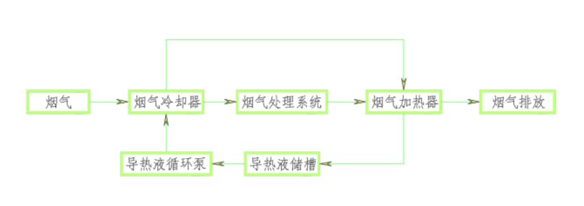 實際運用為在煙氣處理系統的進出口煙道上各設置一套煙氣冷卻器和煙氣加熱器,煙氣冷卻器將高溫煙氣的熱量轉移到煙氣加熱器中加熱低溫煙氣。煙氣冷卻器和煙氣加熱器間通過導熱液實現熱量的傳遞,導熱液包含水、脫鹽水、導熱油、酒精等可吸熱放熱的液體,工藝流程如下圖所示: