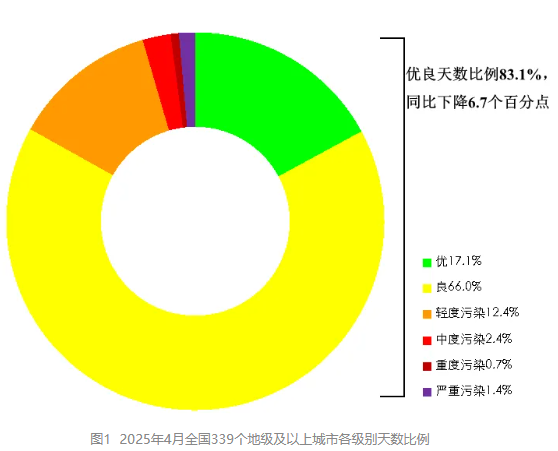 4月,全國339個地級及以上城市平均空氣質量優良天數比例為83.1%,同比下降6.7個百分點;平均重度及以上污染天數比例為2.1%,同比上升0.9個百分點。由沙塵天氣導致的平均超標天數比例為9.7%,其中重度及以上污染天數比例為2.1%。