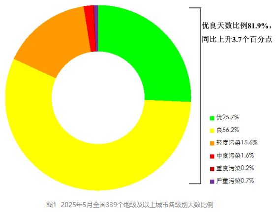 5月,全國339個地級及以上城市平均空氣質量優良天數比例為81.9%,同比上升3.7個百分點;平均重度及以上污染天數比例為0.9%,同比上升0.4個百分點。由沙塵天氣導致的平均超標天數比例為4.2%,其中重度及以上污染天數比例為0.9%。
