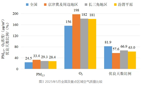 5月,汾渭平原13個城市PM2.5平均濃度為28.4微克/立方米,同比上升2.9%;O3平均濃度為181微克/立方米,同比下降7.2%;平均優良天數比例為63.0%,同比上升14.1個百分點;平均重度及以上污染天數比例為1.7%,同比上升1.7個百分點。由沙塵天氣導致的平均超標天數比例為11.7%,其中重度及以上污染天數比例為1.7%。