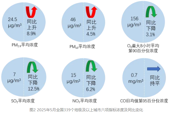 5月,全國339個地級及以上城市PM2.5平均濃度為24.5微克/立方米,同比上升8.9%;PM10平均濃度為46微克/立方米,同比上升4.5%;O3平均濃度為156微克/立方米,同比下降3.1%;SO2平均濃度為7微克/立方米,同比下降12.5%;NO2平均濃度為15微克/立方米,同比下降6.2%;CO平均濃度為0.7毫克/立方米,同比持平。