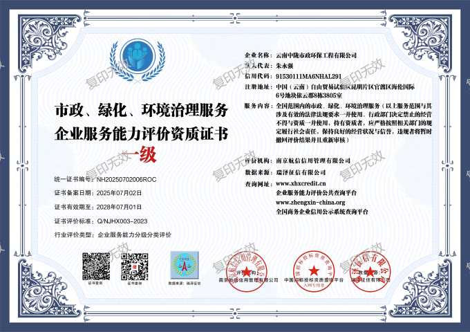 市政、綠化、環境治理服務企業服務能力評價資質證書