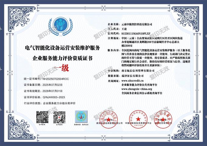 電氣智能化設備運營安裝維護服務企業服務能力評價資質證書
