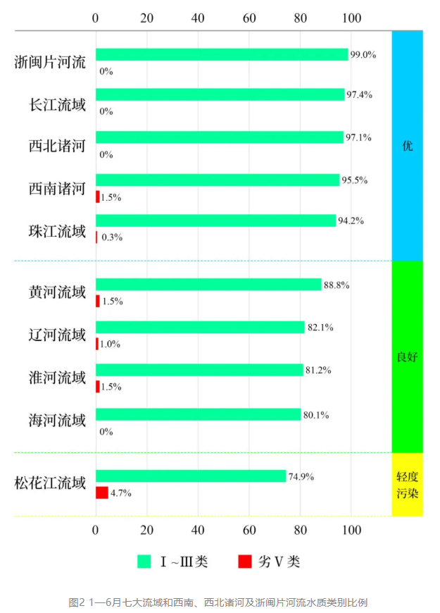1—6月,長江、黃河、珠江、松花江、淮河、海河、遼河等七大流域及西北諸河、西南諸河和浙閩片河流水質優良(Ⅰ—Ⅲ類)斷面比例為90.4%,同比上升0.1個百分點;劣Ⅴ類斷面比例為0.8%,同比上升0.3個百分點。主要超標指標為化學需氧量、高錳酸鹽指數和五日生化需氧量。其中,浙閩片河流、長江流域、西北諸河、西南諸河和珠江流域水質為優;黃河、遼河、淮河和海河流域水質良好;松花江流域為輕度污染。
