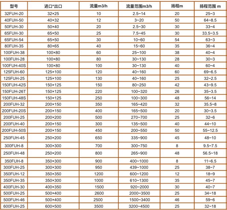 FUH系列工程塑料泵是在消化吸收引進設備的基礎上,結合國內耐腐蝕離心泵結構的優點精心設計而成,該系列泵過流部件采用超高分子量聚乙烯(UHMWPE)制作,其耐腐蝕性能優良、耐磨性能優異(居各種塑料之首)、耐沖擊性能強。泵的密封分別采用機械密封、動力密封和填料密封等多種密封形式,既可以輸送酸堿清液,也可以輸送含固體顆粒的料漿和含各種雜質的污水,尤其在輸送含細顆粒的腐蝕性液體和輸送氫氟酸、氟硅酸、磷酸、混酸、電解液、鹽酸、稀硫酸、濃堿等方面顯示了優良性能。