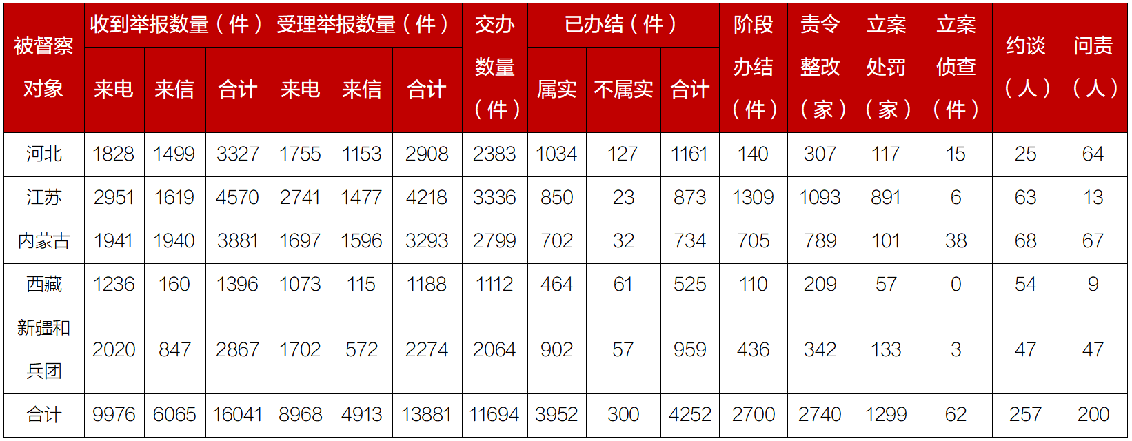 有關省(區)和兵團高度重視督察工作,將督察作為堅決貫徹習近平生態文明思想的重要內容,作為推動高質量發展的重要契機,主要領導通過督察動員、現場督辦、召開專題會議等方式,大力推動整改落實。截至4月25日,各督察組共收到群眾來電、來信舉報16041件,受理有效舉報13881件,經梳理合并重復舉報,累計向相關省(區)和兵團轉辦11694件。相關省(區)和兵團已辦結或階段辦結6952件。其中,立案處罰1299家,立案偵查62件;約談黨政領導干部257人,問責黨政領導干部200人。