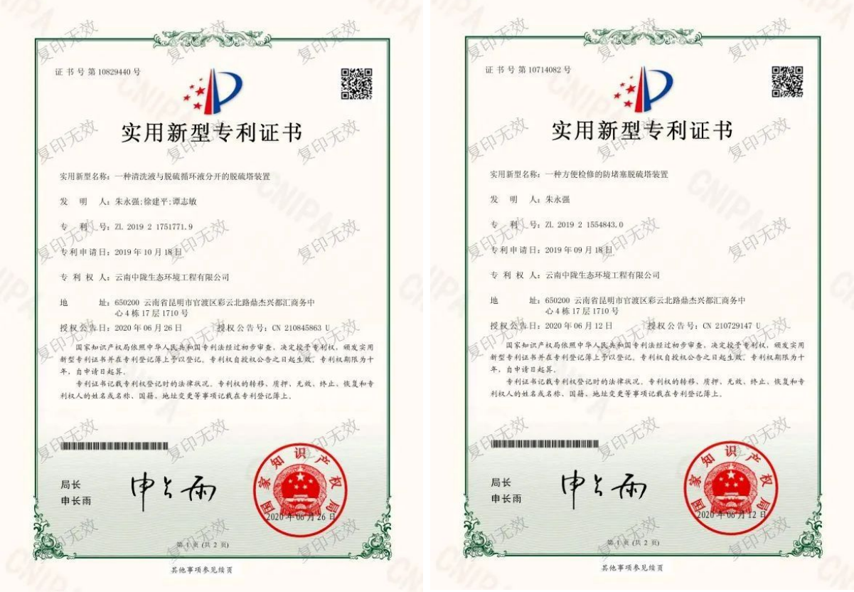 中隴環境已獲得由國家知識產權局認證頒發的脫硫工藝專利證書,這些專利成果是中隴環境在脫硫技術領域長期深耕細作、持續創新研發的有力見證,也是中隴環境為眾多工業企業提供更具優勢、更環保高效的脫硫解決方案的有力支撐。
