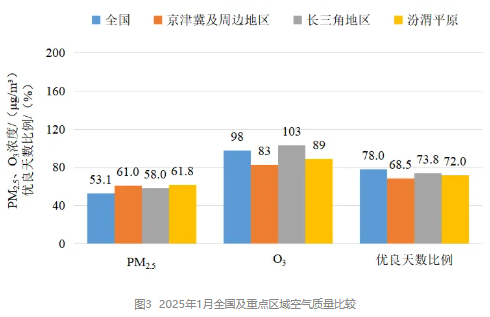 1月,長三角地區31個城市PM2.5平均濃度為58.0微克/立方米,同比下降12.3%;O3平均濃度為103微克/立方米,同比上升21.2%;平均優良天數比例為73.8%,同比上升13.6個百分點;平均重度及以上污染天數比例為0.9%,同比下降1.1個百分點。未出現由沙塵天氣導致的超標天。